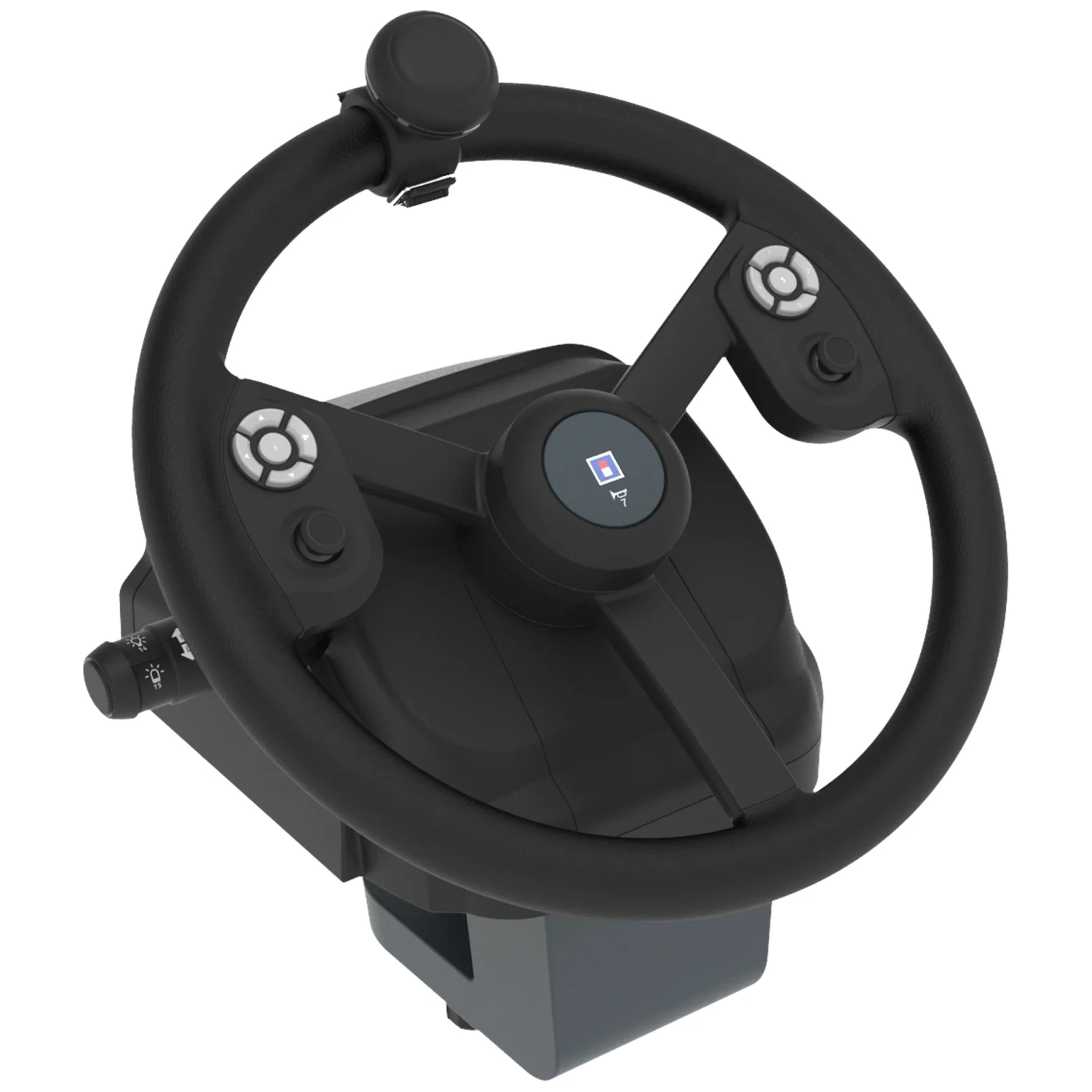 A realistic size 340mm diameter wheel set at a 40° angle and capable of 900° rotation. Operate lights and indicator controls via the turn-signal lever. Designed for operation of tractors and other specialized vehicles to allow smooth and natural handling utilising extremely precise magnetic Hall sensors for high quality and durability.