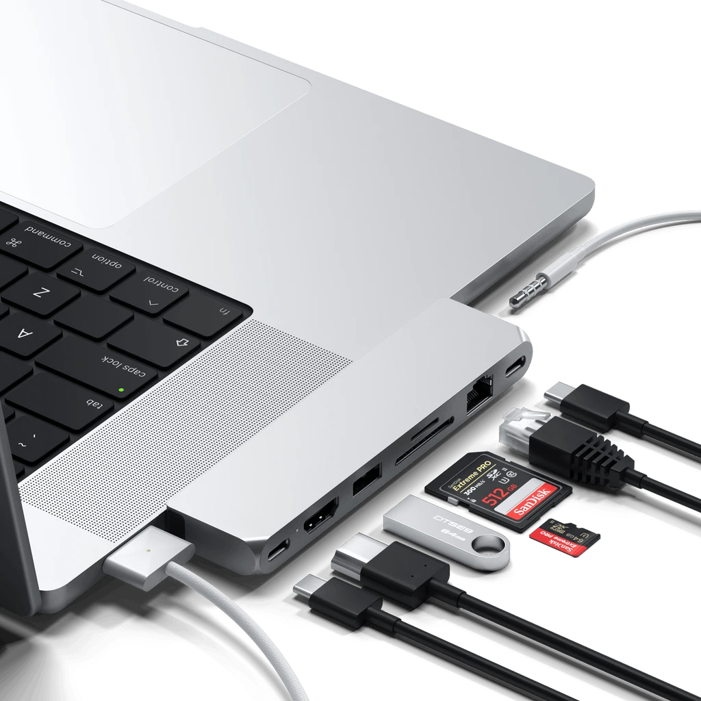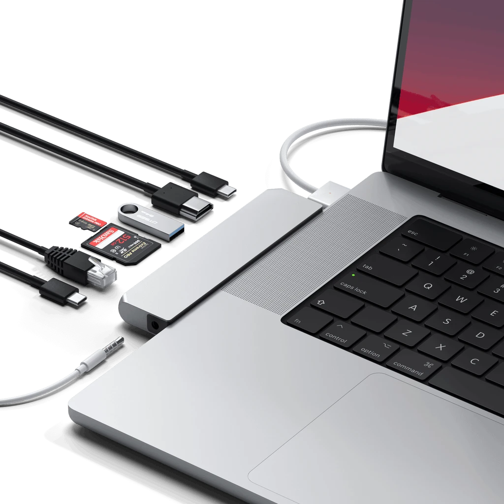 The Satechi Pro Hub Max is your ultimate companion device for your 2023 MacBook Pro. Featuring a full functional USB-C PD port, 4K HDMI output, Gigabit Ethernet, USB-C data, USB-A data, micro/SD card readers, and an audio jack port, the hub provides a plethora of ports so you can work at your best. With its dual USB-C connector and modern aluminum finish, the Pro Hub Max securely attaches to your Mac for a clean, sleek setup. Simply, plug and play to complete your 2023 MacBook Pro experience.Â
