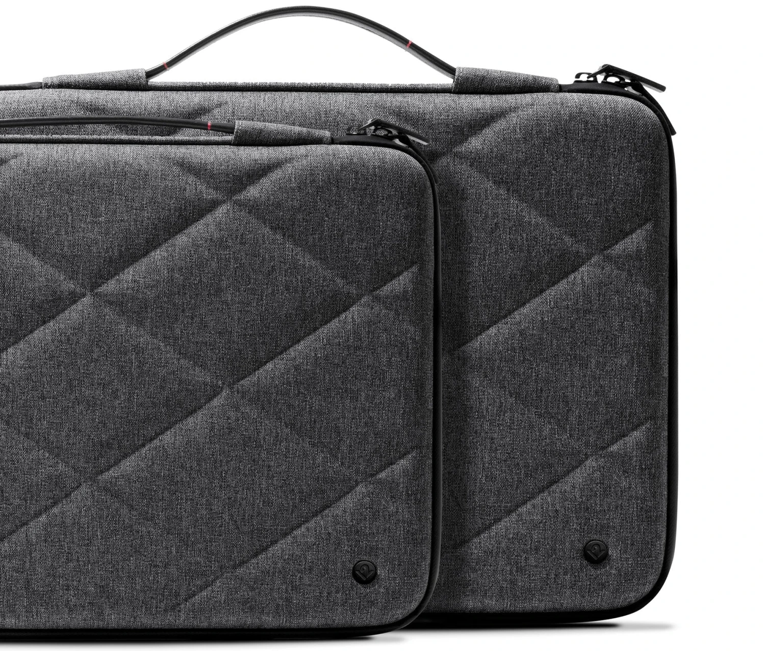 SuitCase provides three layers of protection for your MacBook. First is a water-resistant, quilted fabric exterior. Next, beneath the textile covering is a layer of hard plastic to protect your MacBook from impacts. Finally, inside SuitCase is a soft layer of microfiber to protect the surface of your Mac. Dual zippers keep SuitCase securely closed, allowing easy, safe charging with your MacBook enclosed in this cool grey cocoon.