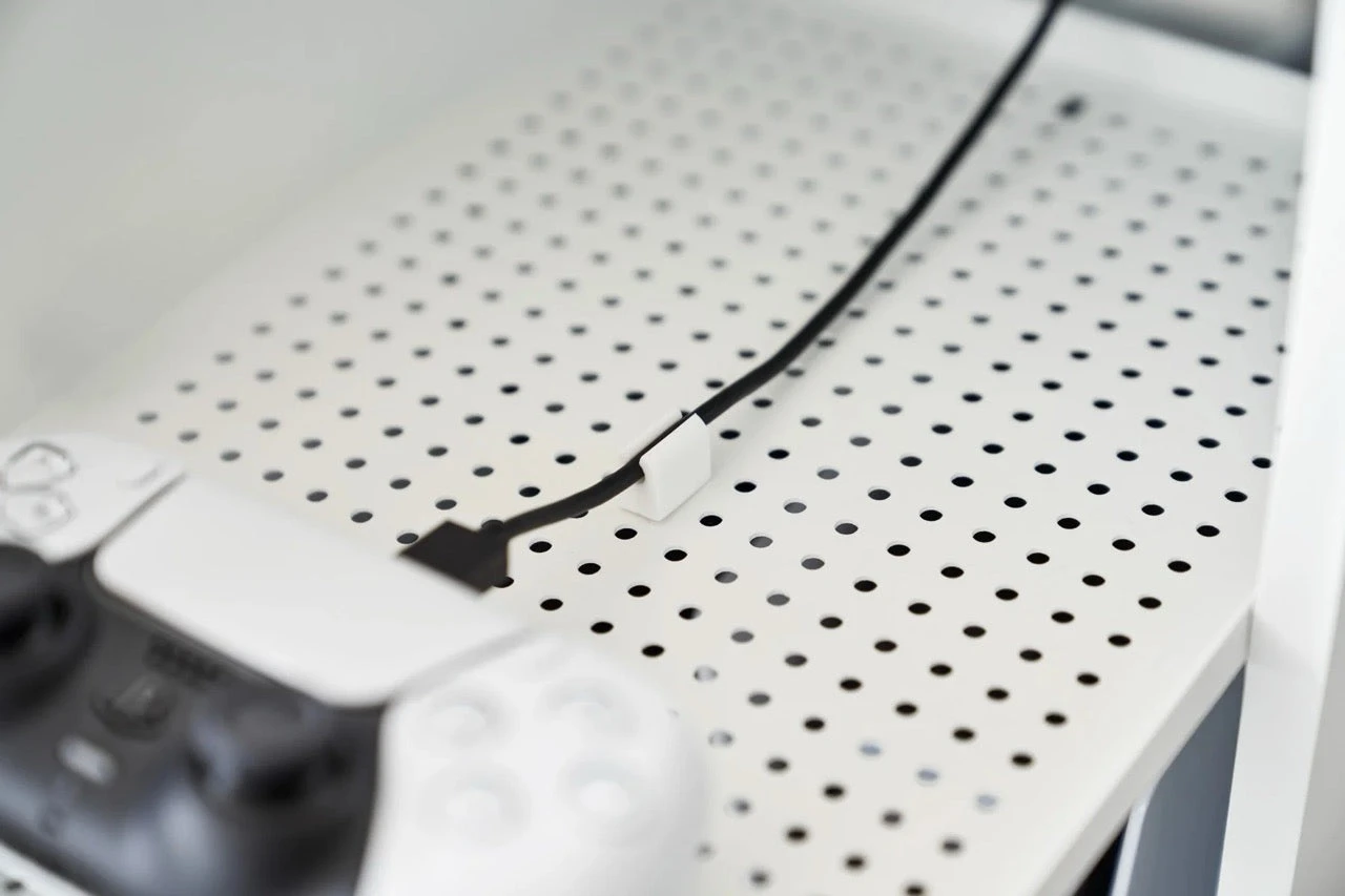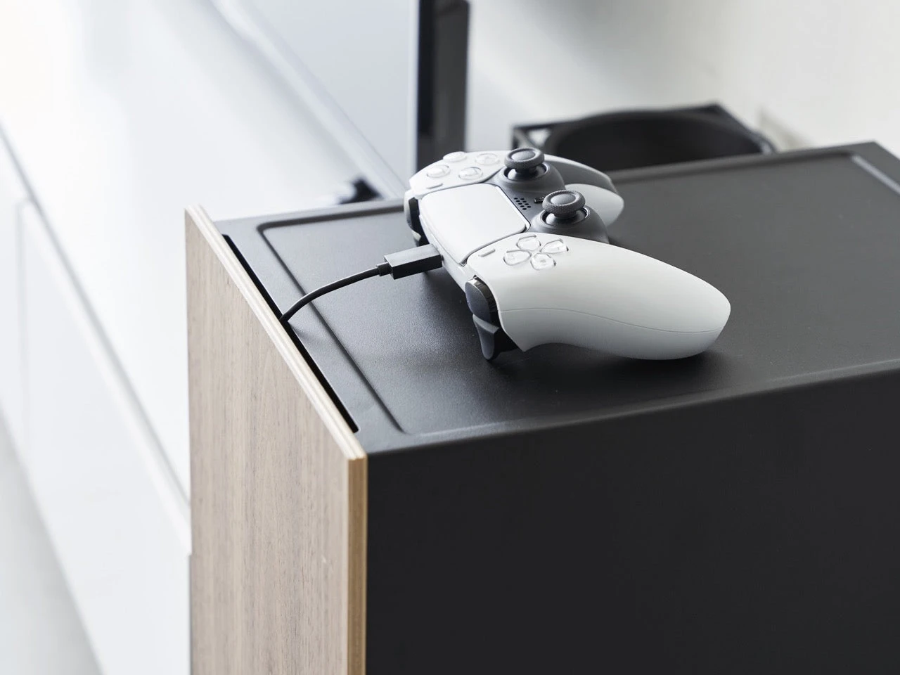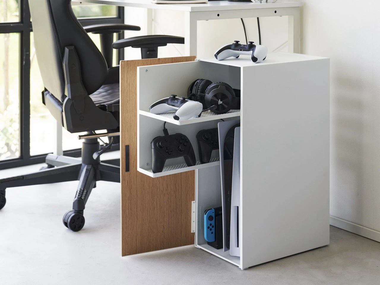 This console organizer ensures tidy storage for gaming essentials. The open-back design prevents overheating, while the wooden door adds style. Two extendable shelves offer organization for controllers and other accessories.